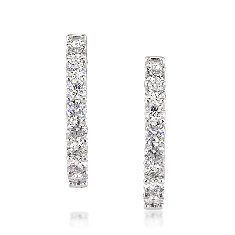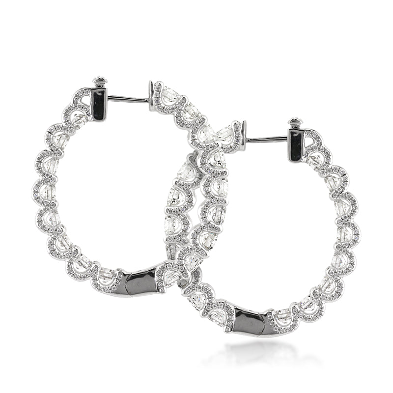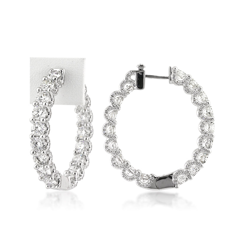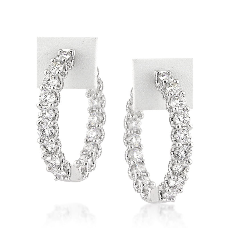 This mesmerizing pair of round diamond hoop earrings sparkle in such an astonishing way! They are set with 11.55ct of round brilliant cut diamonds. There is a row set in front and on the inside of the hoop in a shared prong setting style. The sides are studded with round diamonds throughout the prongs for an incredible brilliance from every angle! These mesmerizing hoops are set with exceptionally white, clear and brilliant diamonds throughout. Light up the world! You are going to love them.