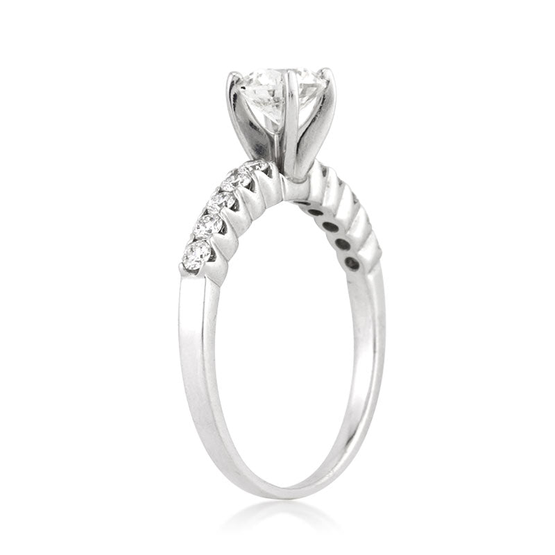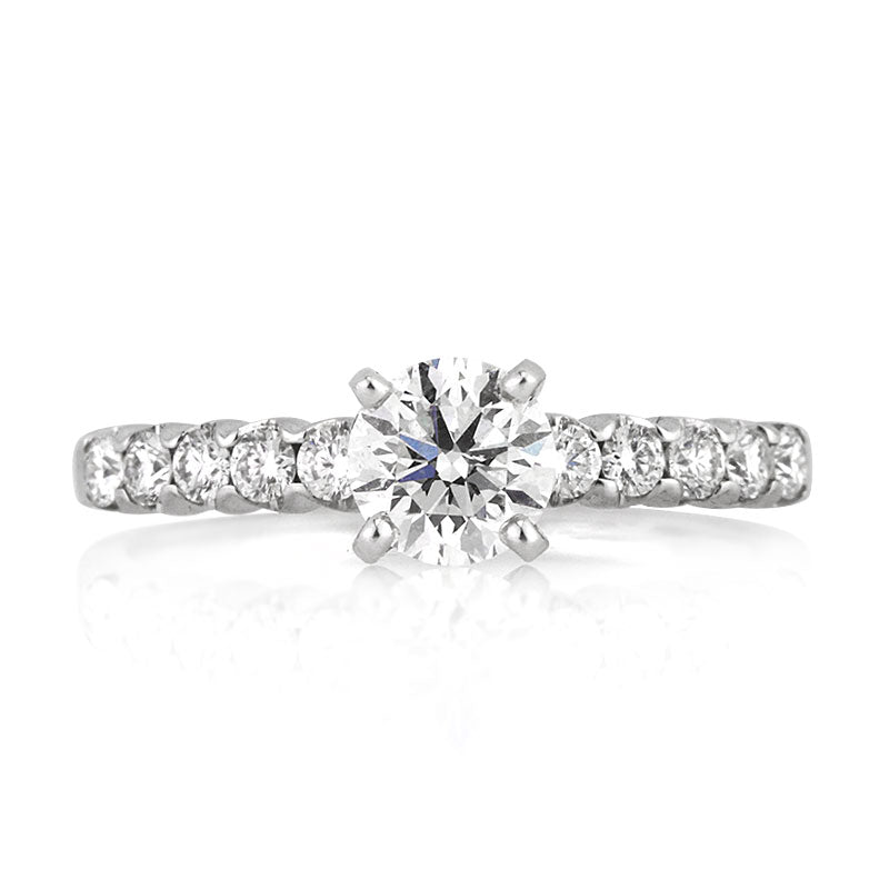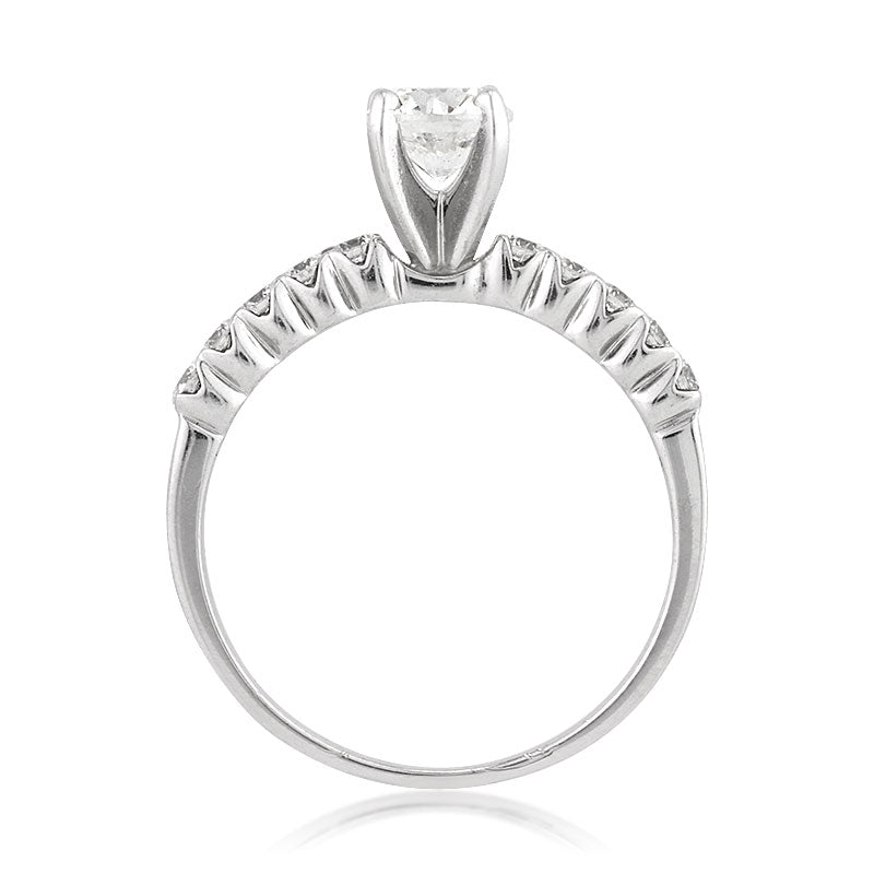 This stunning round diamond engagement ring is simple yet elegant and extremely beautiful! It features a gorgeous 0.73ct round brilliant cut diamond set in the center. It is certified at F-VS2, extra white and extremely clear! It has an outstanding cut as well and shimmers with outstanding brilliance! It is accented by five extremely brilliant round diamonds on each side in a shared prong setting. All you see are diamonds! It is a stunning design. Exceptional quality, mesmerizing brilliance, and exceptional value!