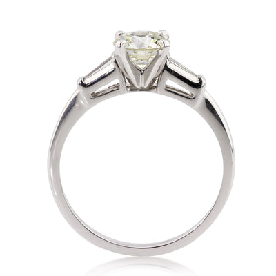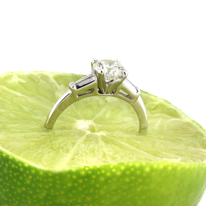 This simple, elegant and extremely beautiful round diamond engagement ring has so much fire! The 1.07ct round diamond set in the center is GIA certified (one of the leaders in diamond grading) at K-VVS1. It has a hint of color but faces up white and it is practically flawless! The cut is spectacular! It is flanked by two baguette cut diamonds and set on high polish platinum. An extremely elegant round diamond engagement ring symbolizing your love and devotion beautifully!
