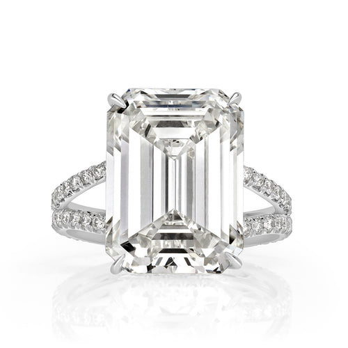 Make an impressive statement on her finger with this beautiful emerald cut diamond engagement ring. The captivating 11.31ct emerald cut center diamond is GIA certified at K-VS1. It has a hint of warmness, faces up super clean and sparkles immensely! The platinum setting showcases round brilliant cut diamonds accented on the split shank double row design as well as additional diamonds on the basket bar. Be the center of attention in every room with this incredible emerald cut diamond ring!