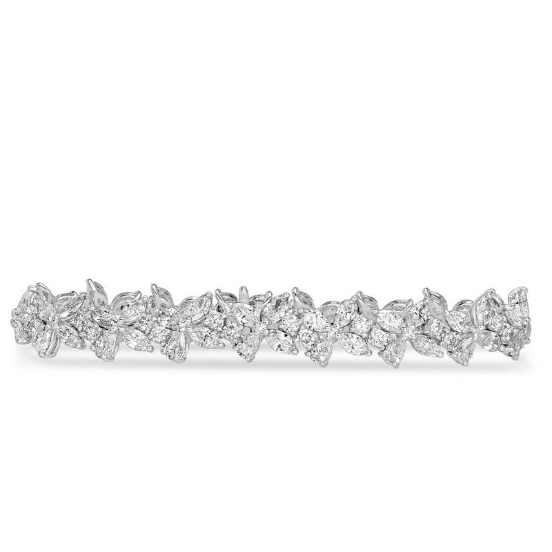 What an absolute beauty! This luxurious diamond bracelet features a stunning mosaic of pear shaped, marquise and round brilliant cut diamonds set in an intricate floral pattern. All of the diamonds are perfectly matched and graded at E-F, VS1-VS2. They are each hand selected for the amazing combination of their qualities and set in high polish 18k white gold. It will be the perfect accessory to any cocktail dress!