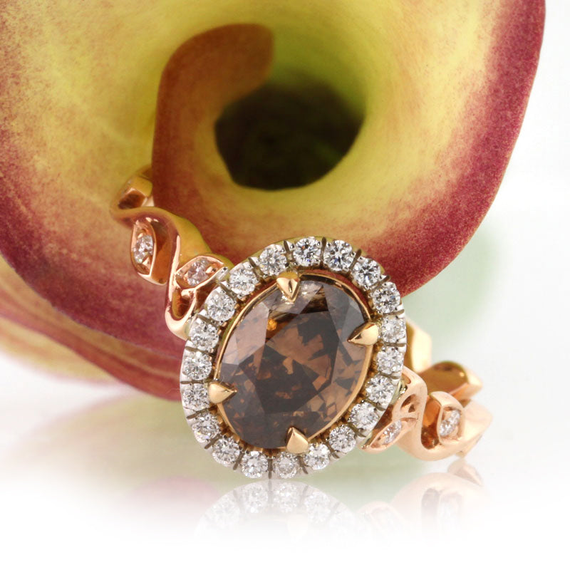 This one of a kind, mesmerizing fancy brown oval cut diamond ring is sure to grab attention wherever you go! The spectacularly beautiful 1.00ct oval cut diamond set in the center is GIA certified (one of the leaders in diamond grading) at Fancy Dark Brown I1. It has a very rich and deep cognac color and the inclusion is all the way off to the side and placed under one of the prongs giving you that eye clean look. The cut is outstanding and it sparkles tremendously! It is surrounded by a halo of round diamonds in a micropave setting which showcases the stones beautifully! The shank is made in high polish 18K rose gold and features a gorgeous leaf design that has diamond accents throughout. This one of a kind piece is gorgeous from every angle!