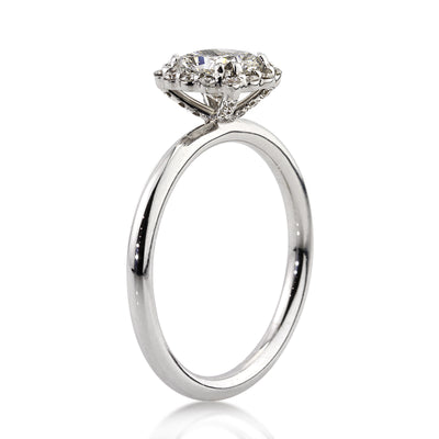 This spectacular cushion cut diamond engagement ring was custom made with simplicity in mind. It features one of the most gorgeous 1.02ct cushion cut diamonds you have ever seen! It is certified by EGL (one of the leaders in diamond grading) at D-VS2; the best color and very clear! It has a gorgeous cut! We set a halo of round diamonds around it in a shared prong setting. The diamonds stand out superbly! The connectors of the ring are also set with round diamonds for added beauty. The shank is simple, high polish white gold in a solitaire style setting. The center stands out so beautifully! This is one of those pieces you will cherish forever! Truly a spectacular piece!