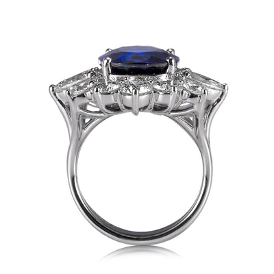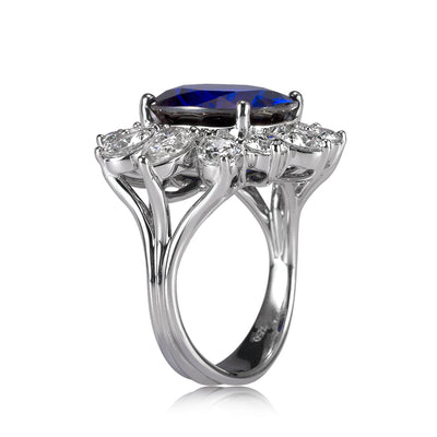 Look and feel glamorous with this shockingly beautiful sapphire and diamond 18k white gold ring on your finger. The design is exquisite and showcases the 10 carat sapphire centerstone in a very flattering manner. The outer halo consists of round and pear shaped diamonds that create a beautiful outline.