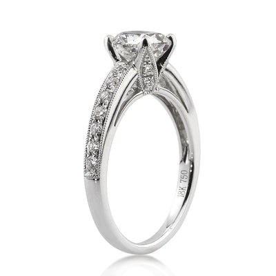 This simple, elegant and exceptionally beautiful cushion cut diamond engagement ring has an excellent combination. It all starts with the 1.21ct cushion cut ciamond poised in the center. It is GIA certified at F-SI1, exceptionally white and perfectly eye clean! It has a stunning cut as well. At 1.21ct you get the look of a one and a half carat center without the big jump in price! The high polish 18k white gold setting features a row or round diamonds pave set down the shank. The unique center prongs are also studded with round diamonds for an added touch of brilliance! You will love everything about this beautiful engagement ring! Amazing in every way.