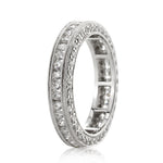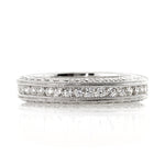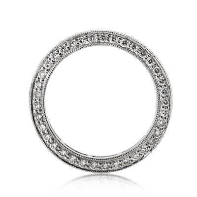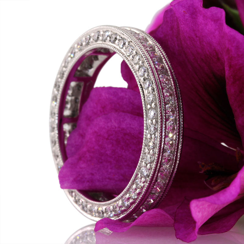 This custom-made round diamond eternity band has elegance, brilliance and beauty that will knock you off your feet! It features a row of round brilliant cut diamonds channel set on the top with fine milgraining on the sides. The front and back of this magnificently beautiful ring is set with round diamonds, pave set all around. The look and feel of this piece is exceptional! Sparkle from every angle with this gorgeous and unique diamond eternity band!