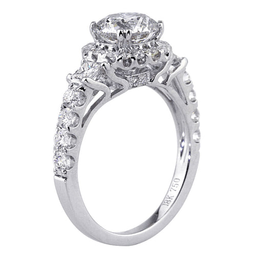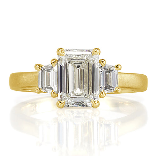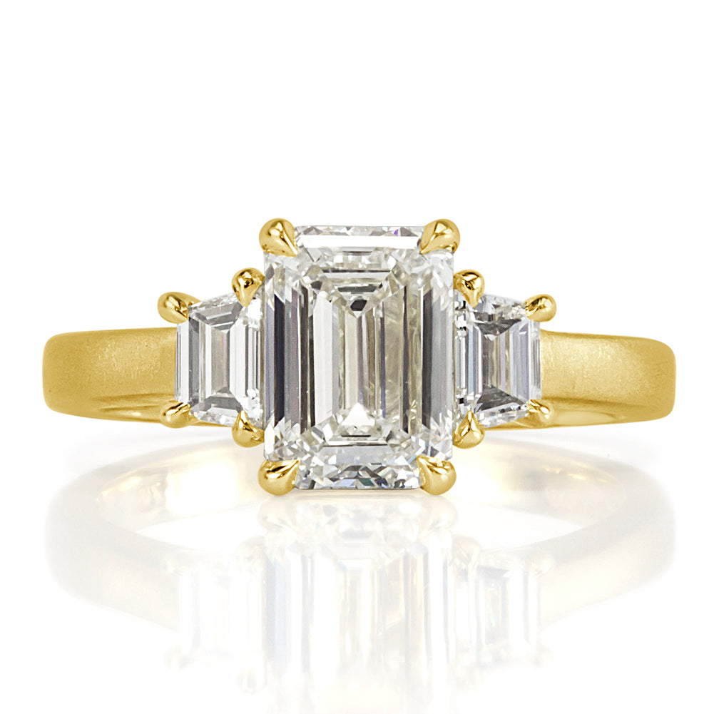 This dazzling emerald and trapezoid cut diamond combination on this 18k yellow gold engagement ring is a triple threat showstopper! This three-stone ring features a crisp 2.00ct emerald cut diamond GIA certified at J VS1. The centerpiece is complimented on each side with 0.47ct of trapezoid cut  diamonds certified at I-J, VS1 gradings. With it's grand allure, this piece is sure to sparkle from miles away.