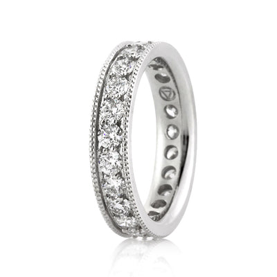 Forever timeless and stylish, this substantial round diamond eternity band is made for a lifetime. The brilliant round diamonds are perfectly set next to one another in a shared prong design. The band features milgrain detail on the edges of the band giving it a vintage feel.