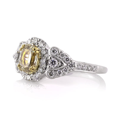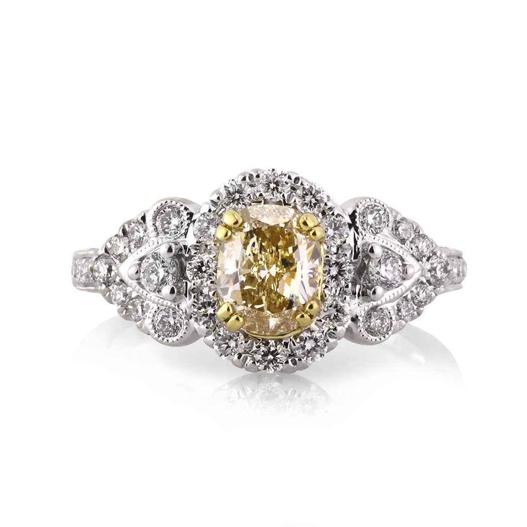 Captivating and full of color, this fancy yellow oval cut diamond engagement ring has a very unique and beautiful design. The stunning 1.03ct oval cut center diamond is EGL certified at Fancy Yellow VS1. It has a very vibrant fancy yellow color, and it is perfectly clear, even under 10X magnification. It is surrounded by a halo of round diamonds and sparkling round diamonds set on the side design and down the shank. The center basket area features a gorgeous filigree design which is handcrafted to perfection with milgrain. It is immensely impressive. Enjoy the compliments you'll be getting wearing this magnificent fancy yellow diamond ring.