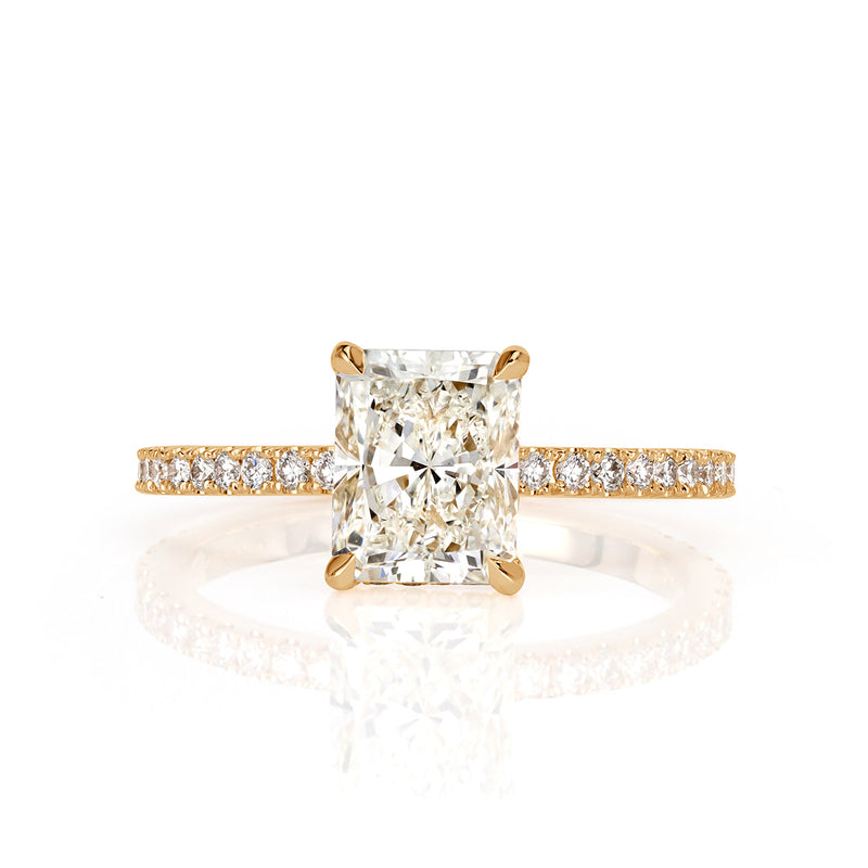 With almost identical sparkle factor as a round brilliant cut diamond, this mesmerizing radiant cut diamond engagement ring displays shimmering brightness! The stunning 1.70ct radiant cut poised in the center is GIA certified at I-SI1. The incredible cut of this diamond allows the centerstone to display amazing finger coverage. The polish and symmetry are both graded at excellent and the scintillation of this beauty is unparalleled. The hidden halo diamond encrusted basket is perched on top of a classic, dainty micropave 18k yellow gold setting. Capture her heart forever with this beautiful work of art!