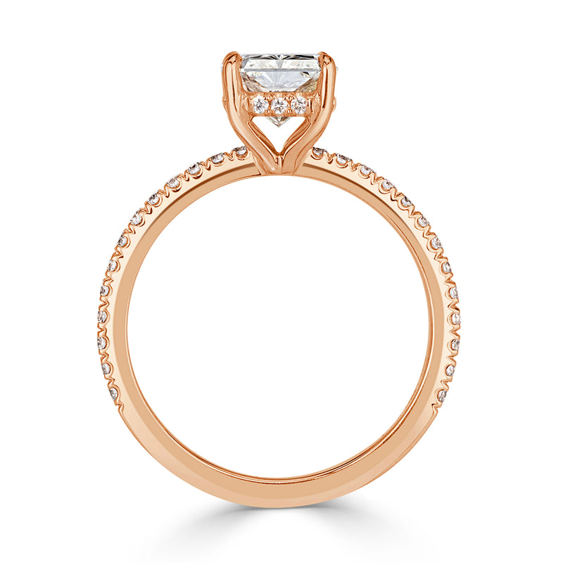 This stunning radiant cut diamond engagement ring will make your significant other a very happy lady! It features a 1.74ct radiant cut diamond GIA certified at I-VVS2, an incredible combination. It faces up beautifully white and is nearly flawless in clarity. This beauty measures at 8.23x6.35 mm, an amazing proportion that it faces up enormous for it's weight! The fiery scintillation the diamond gives off is due to it being graded at excellent in cut, polish and symmetry. Dazzling round brilliant cut diamonds are handset on the finely detailed hidden halo and shank of this lovely 18k rose gold setting. She'll fall in love with you all over again when you present her with this enchanting radiant cut diamond engagement ring.