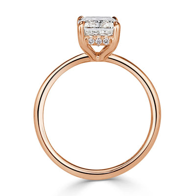 This elegant radiant cut diamond engagement ring is feminine and dainty. The 18k rose gold solitaire setting features a 2.02ct radiant cut diamond GIA certified at J-VVS1. It is very white and near flawless in clarity. The great cut allows for maximum brilliance and fire. The two carat stone is supported by a subtle hidden halo of dazzling round brilliant cut diamonds adding just the right amount of extra sparkle. The delicate solitaire band setting allows the diamond to appear floating on the finger with all of it's glimmering beauty! Present this extraordinary ring to your princess and she will make you her prince!
