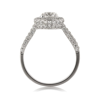 This mesmerizing round cut diamond engagement ring will make her say yes! The gorgeous design and sparkle of this engagement ring is mesmerizing! It all starts with the spectacular 0.90ct round brilliant cut center diamond. It is EGL Certified at D-I1. It is exceptionally white and the inclusions are white as well, blending in to the diamond and giving you an eye clean look! It sparkles like crazy! It is accented by a halo of round diamonds in a pave setting and two rows of round diamonds on the center basket. The shank is pave set with round diamonds on all three sides. It is low profile and sits on the finger in a very sleek design. Exceptionally beautiful and so very brilliant!