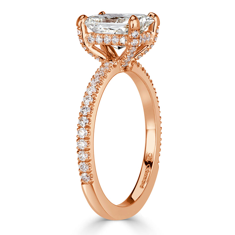 Radiant cuts are absolutely spectacular and this one is of no exception! The 1.70ct Radiant cut featured in the center of this engagement ring is GIA certified at J-VVS1, a lovely white and nearly flawless in clarity. This beauty measures 8.01 x 6.24mm, a phenomenal proportion that allows it to face up much larger than it's actual carat weight! In addition, it's premium grading at excellent in cut, polish and symmetry maximizes it's true potential in dazzling rainbow brilliance. This handpicked stunner  is set on an exquisite 18k rose gold setting accented by round brilliant cut diamonds pavé set on either side going down a little past halfway. Diamonds are meticulously embedded into the basket connectors and hidden halo of this design as well. This remarkable radiant cut diamond ring will no doubt be the winner in her eyes!