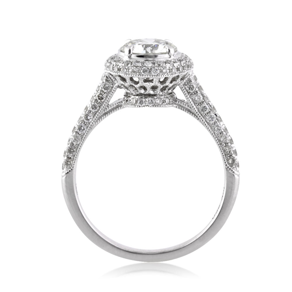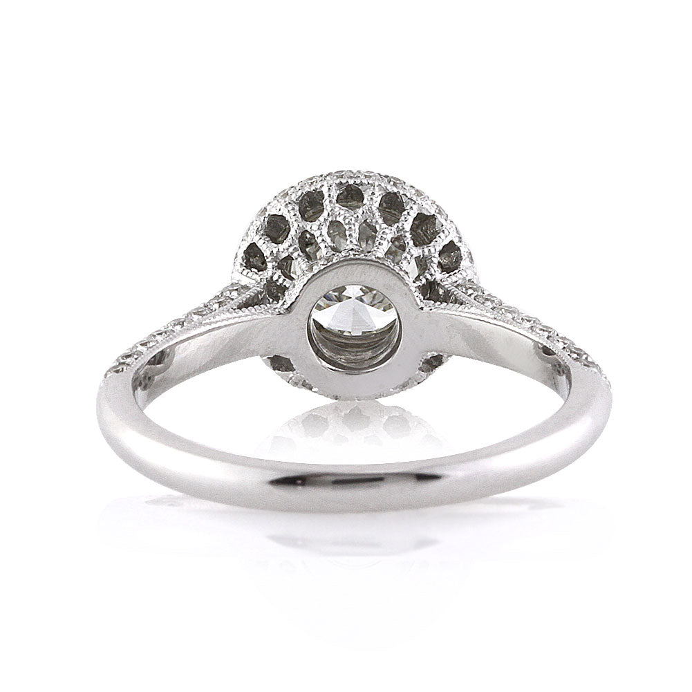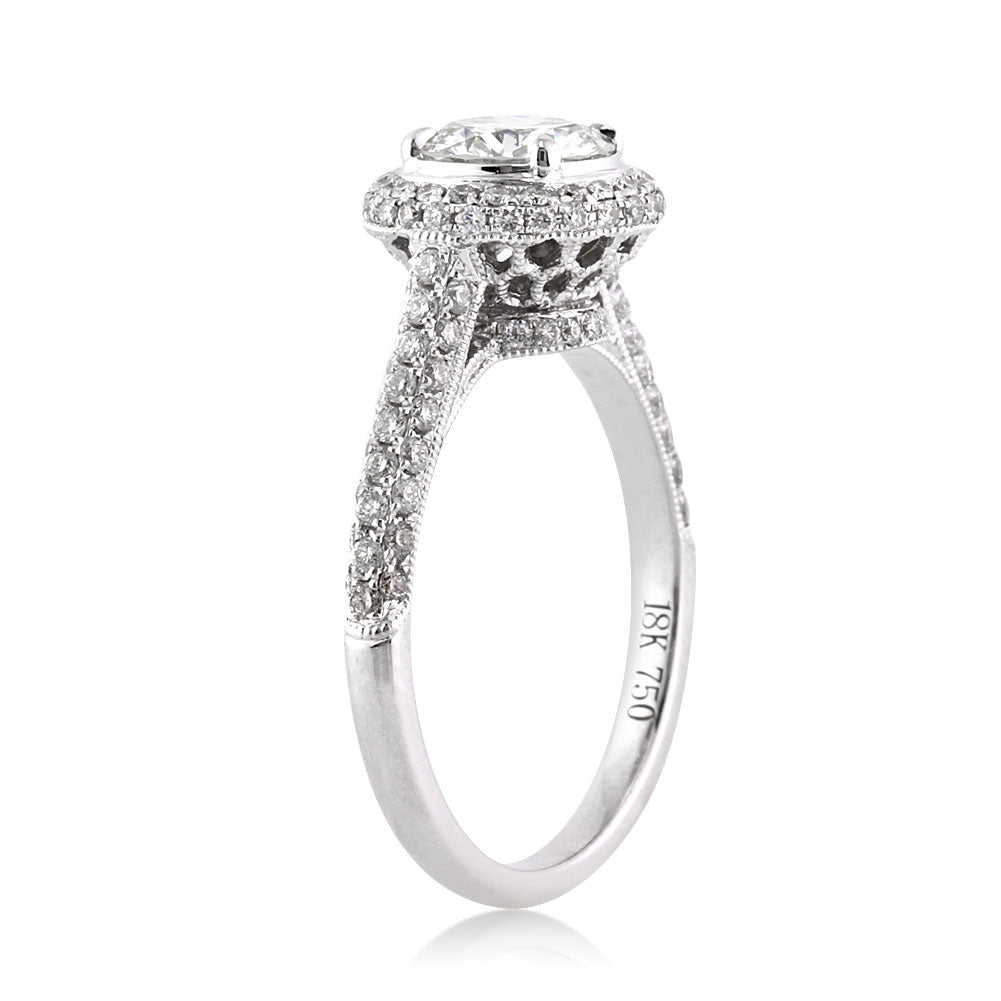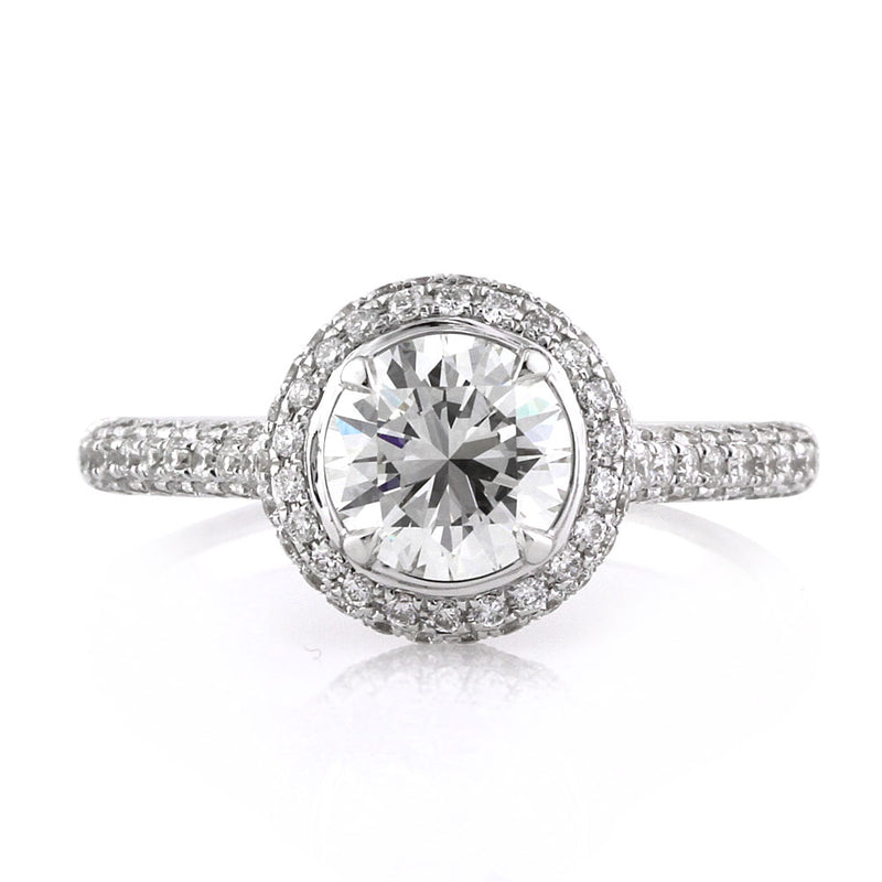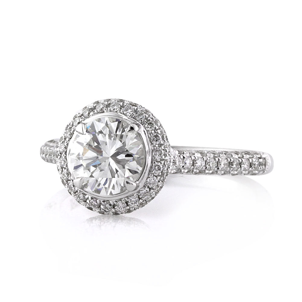 From every angle of this exquisite round brilliant cut diamond engagement ring, there is intense sparkle. It starts with the 1.03ct round brilliant cut diamond featured in the center. The one carat center stone is GIA certified at I-VS1, and it faces up very brilliant and white. It has an excellent color and clarity combination that is shown off quite well in this custom pavé setting. A two row, rounded halo frames the round center diamond and more pavé set round brilliant diamonds embellish the shank and the gallery for incredible sparkle. As a fine finishing touch, hand laid milgrain detail is added to this 18k white gold diamond setting. This spectacular round brilliant cut diamond engagement ring garner compliments in any room.