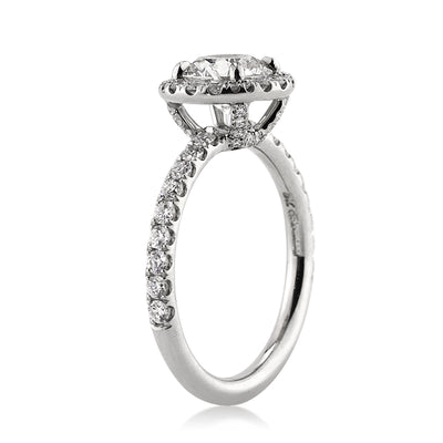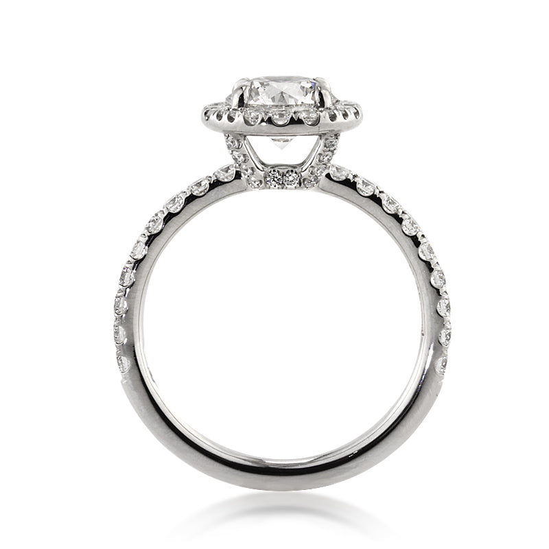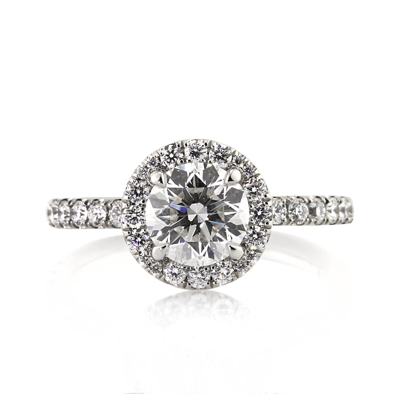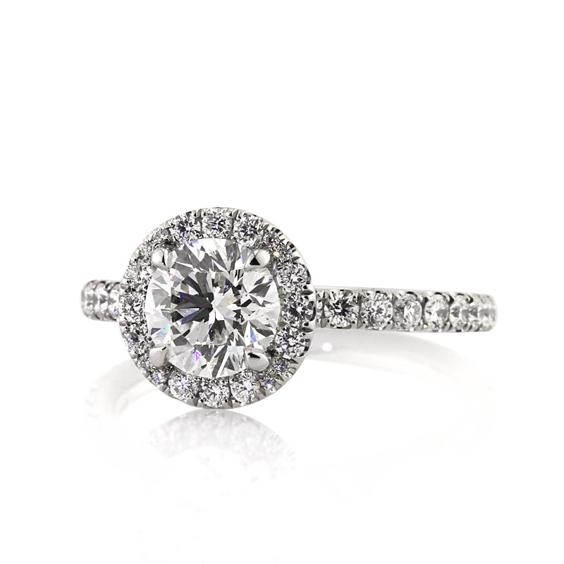 This sensationally beautiful round brilliant cut diamond engagement ring has such an excellent combination! It features a mesmerizing 1.20ct round diamond in the center. It is GIA Certified, one of the leaders in diamond grading, at G-SI1. It is perfectly white, very clear and the cut is exceptionally beautiful. It sparkles tremendously! It is accentuated by a halo of round diamonds and a row of round diamonds set down the shank. The center basket is studded with round diamonds as well. It is made in high polish platinum. So elegant and beautiful, you will cherish it forever!