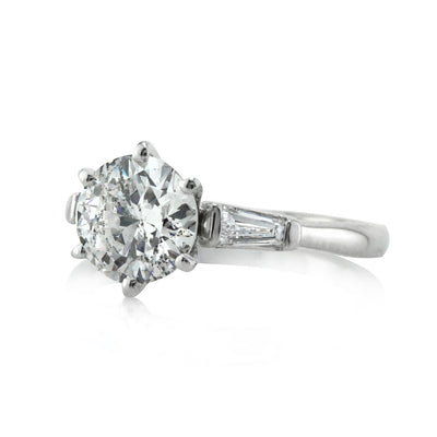 Classic, timeless yet unforgettable, this arresting 1.90ct round brilliant cut diamond engagement ring is an elegant beauty. AGS certified at I-I1, this stone faces up white and blends in 95% eye clean. It is showcased perfectly between six prongs set in a 14k white gold high polish setting.  Complimented by two astonishing tapered baguette cut sparklers channel-set at the sides, the nice clean lines create a refined and beautiful effect. Cherish this everlasting symbol of your love until the end of time.