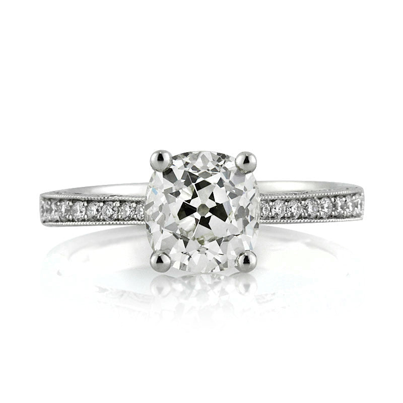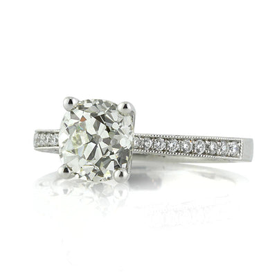This rare antique cushion brilliant diamond engagement ring features a spectacular old style cut center stone. The 1.86ct old mine cut poised at the center is GIA certified at N-VS1. The almost two carat diamond possess a lovely warm color, like romantic candlelight, and is perfectly eye clean. It is set atop a very elegant, vintage style platinum setting with pavé set round diamonds and milgrain detail evident throughout. This breathtaking antique cushion brilliant is perfect for that classy, sophisticated lady.
