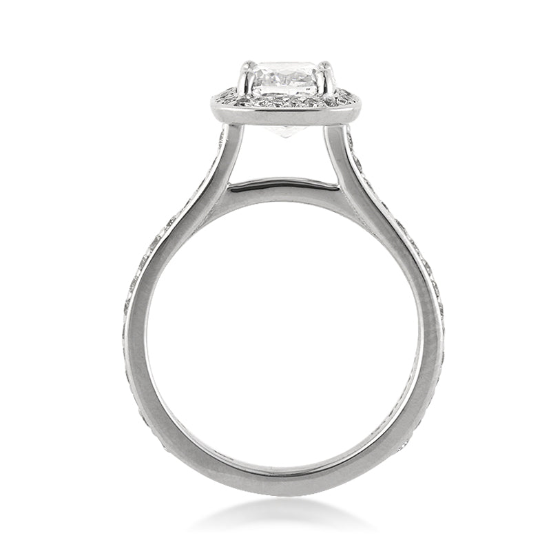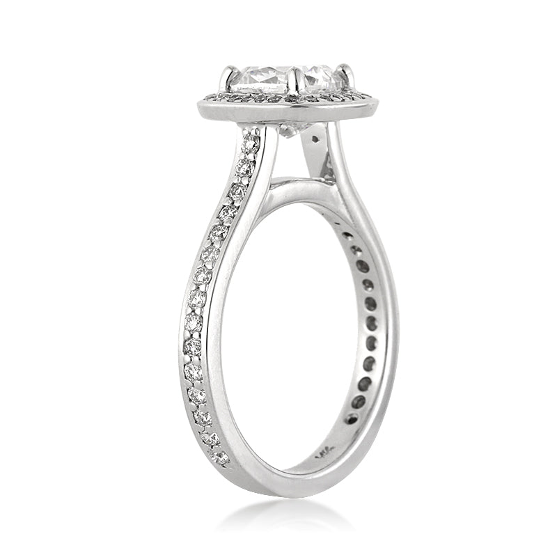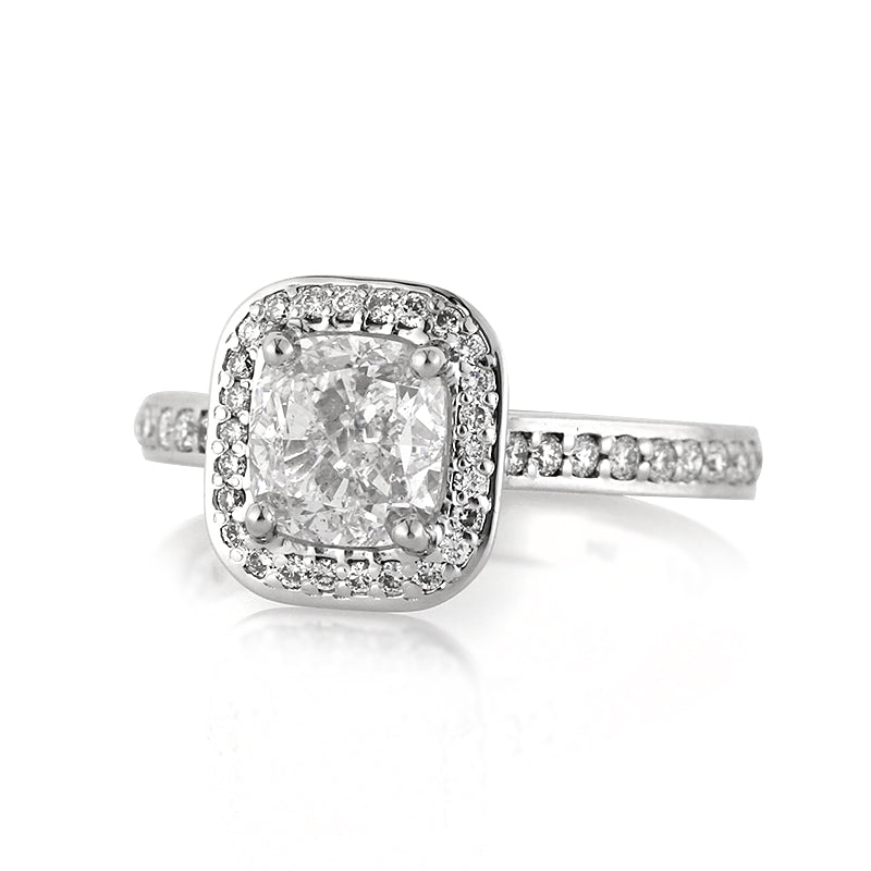This stunning cushion cut diamond engagement ring has such an amazing design and it sparkles tremendously! The beautiful 1.52ct cushion cut diamond poised in the center is GIA certified at D-SI2. It is exceptionally white and eye clean, and it sparkles tremendously! It is accented by a halo of round diamonds and a row of round diamonds set down the sides. The center diamond is so beautifully showcased atop this wonderful ring. A perfect symbol of love and devotion!