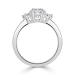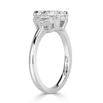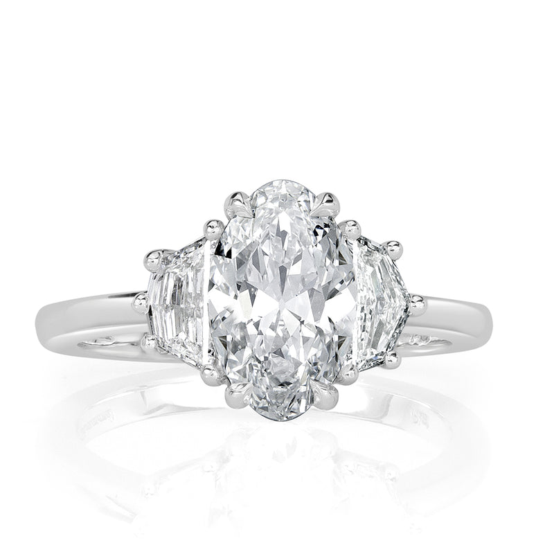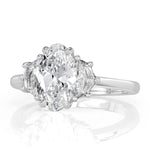 Bathe in compliments with this unique three-stone oval cut diamond engagement ring. The exquisite platinum setting features a 1.61ct oval cut center diamond GIA graded at D-VVS2, completely colorless and near flawless in clarity! The centerpiece measures at proportions of 10.47 x 6.49mm. With these incredible measurements and it's super elongated shape, this 1.61ct diamond looks much larger than what it actually is. It is accentuated by two sparkling cadillac cut side diamonds. The cut of the cadillac diamonds compliment the oval cut beautifully and displays immense brilliance and presence. All the elements of this oval cut diamond ring come together perfectly.