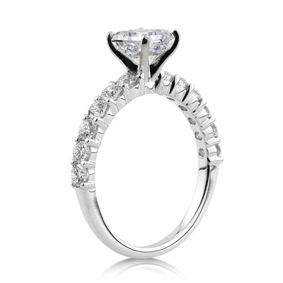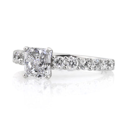 This mesmerizing and exceptional radiant cut diamond engagement ring will dazzle you. It all starts with the magnificent 1.22ct radiant cut diamond set in the center. It is GIA Certified (one of the leaders in diamond grading) at E-VVS2, exceptionally white and practically flawless! It has excellent proportions and it is exceptional in quality and cut as well! It is accented by six round diamonds in a shared prong setting on each side for a simple and very elegant look. The diamonds stand out so beautifully with hardly any metal showing! This one of a kind piece is sure to please. You will love it!