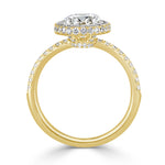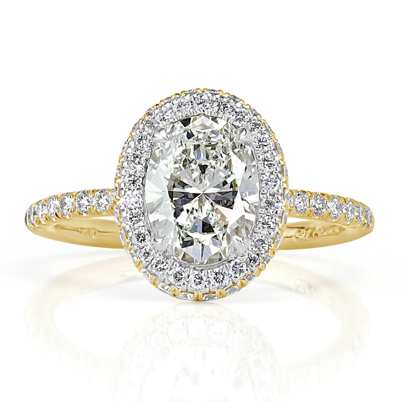The gorgeous oval cut diamond set in this magnificent engagement ring is captivating to say the least. The beautiful 1.53ct oval cut center diamond is GIA certified at H-VVS1, a spectacular combination. The diamond is a dazzling white and nearly flawless. It is composed of meticulously cut facet patterning and sparkles with fiery brilliance due to its 2x Excellent polish and symmetry grading. The center basket is adorned with additional diamonds underneath the halo as well as diamonds going up the connectors. Viewed from any angle, this oval cut diamond engagement ring will sparkle and shine.