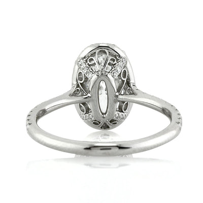 This exquisite oval cut diamond engagement ring was expertly crafted with fine detail. The elongated 1.50ct oval cut diamond at the center is GIA certified at E, VS2. The one and half carat center stone is colorless and eye clean. A perfectly proportioned round brilliant cut halo encircles the center diamond. Micro pave set round diamonds adorn the connectors and the shank as well. For the finishing touch, fine filigree detail was added on the basket of this platinum setting. This elegant oval cut diamond ring will capture compliments for a lifetime.