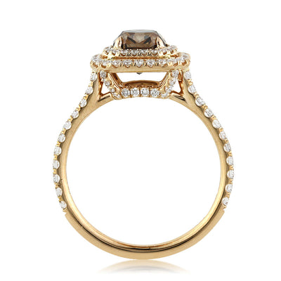 Beautiful rose gold and fancy brown diamonds make for an intensely rich color combination on this phenomenal double halo diamond engagement ring. Featured in the center is a 1.41ct radiant cut diamond that is GIA certified at Fancy Dark Orange Brown- SI1. The color is a dark, lovely brown and the cut a gorgeous old mine-like cut with a taller crown. The almost one and a half carat center diamond is encompassed by a double halo of round brilliant cut diamonds set in a micro pave setting. There are more round diamonds set down the dainty shank and on the connectors of this 18k rose gold setting giving it incredible sparkle. This exquisite engagement ring will be the envy of all whom lay eyes on it!