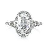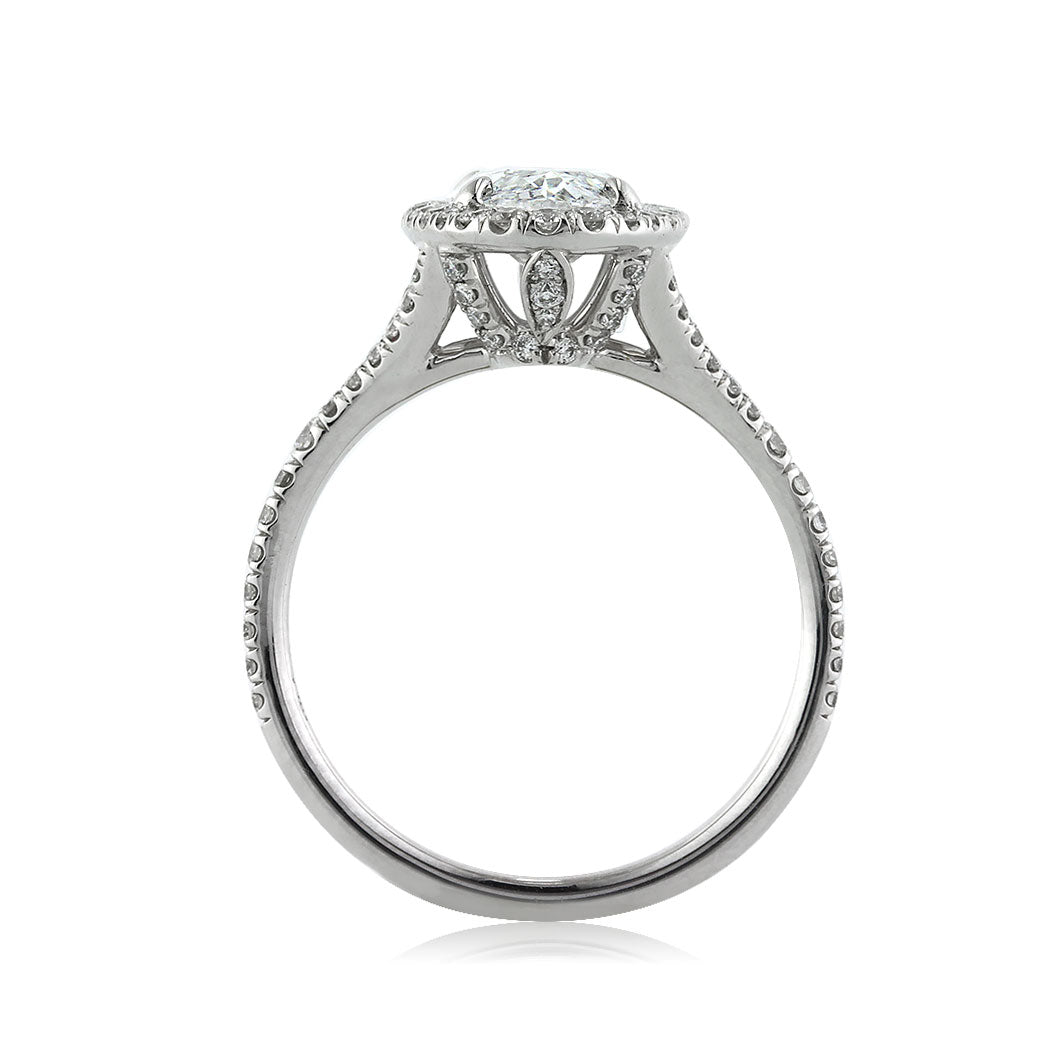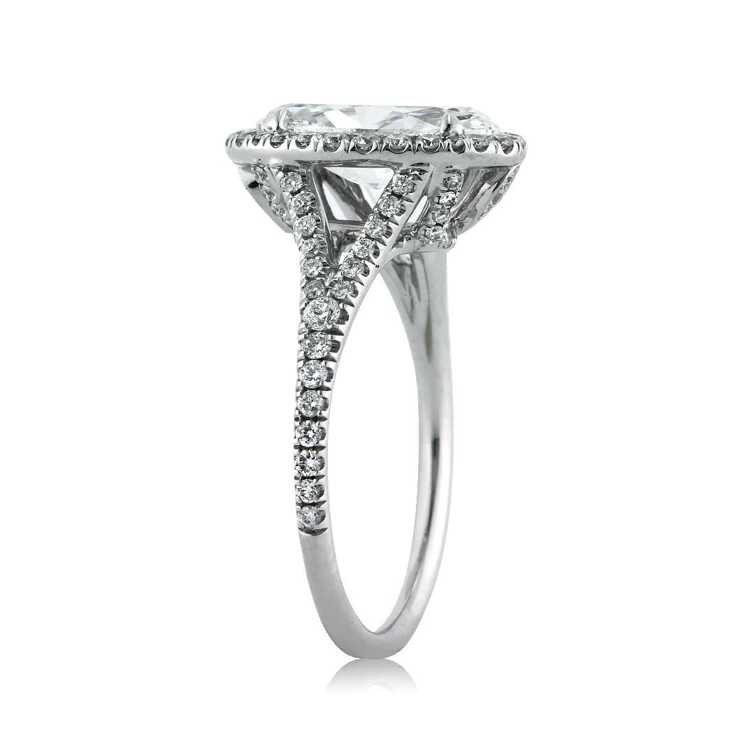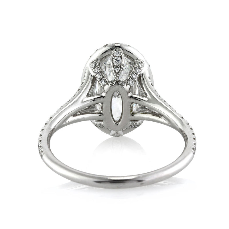 This charming and absolutely mesmerizing oval cut diamond engagement ring is so beautiful. It all starts with the amazing 1.71ct oval cut center diamond, which is GIA certified at D-VVS1. It is exceptionally white, almost flawless in clarity and the cut is elongated and beautiful giving you great proportions! This diamond sparkles immensely. It is stunning! The halo of round diamonds accents it perfectly. The split shank combines in to one going down the sides of the ring and is set with round diamonds in a micro pave setting style, showcasing the diamonds beautifully with minimal metal showing. The center basket is gorgeous and studded with round diamonds as well. This platinum masterpiece is truly sensational. You will cherish it forever!