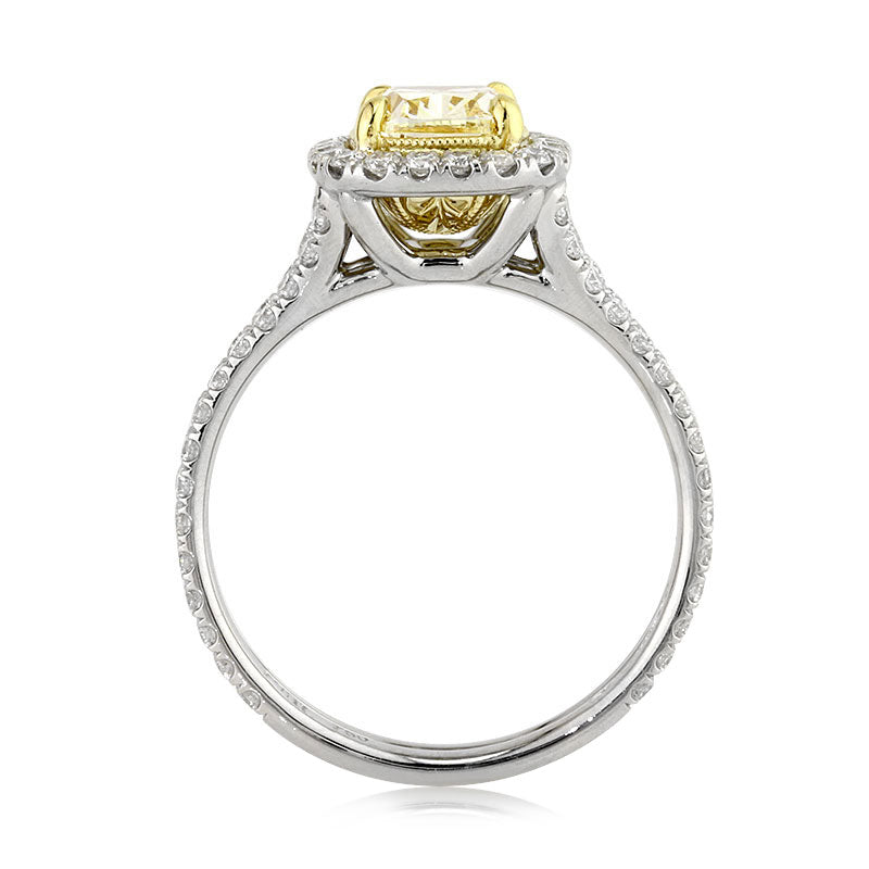 This enchanting fancy yellow cushion cut diamond engagement ring will leave you speechless! The remarkable 1.32ct cushion cut center diamond is GIA certified, one of the leaders in diamond grading, at Fancy Light Yellow VVS1. It has a very pure, vibrant and beautiful canary yellow color and it is a step away from flawless in clarity! The gorgeous elongated shape and cut will captivate you. It sparkles magnificently! This gorgeous diamond is accented by a halo of round diamonds and a split shank set with round diamonds, all in a micro pave setting. The ring is made in high polish platinum and features a gorgeous 18k yellow gold center basket that is beautifully hand engraved throughout. This masterpiece gives you tremendous quality, brilliance and beauty at an astonishing value. You will cherish it!