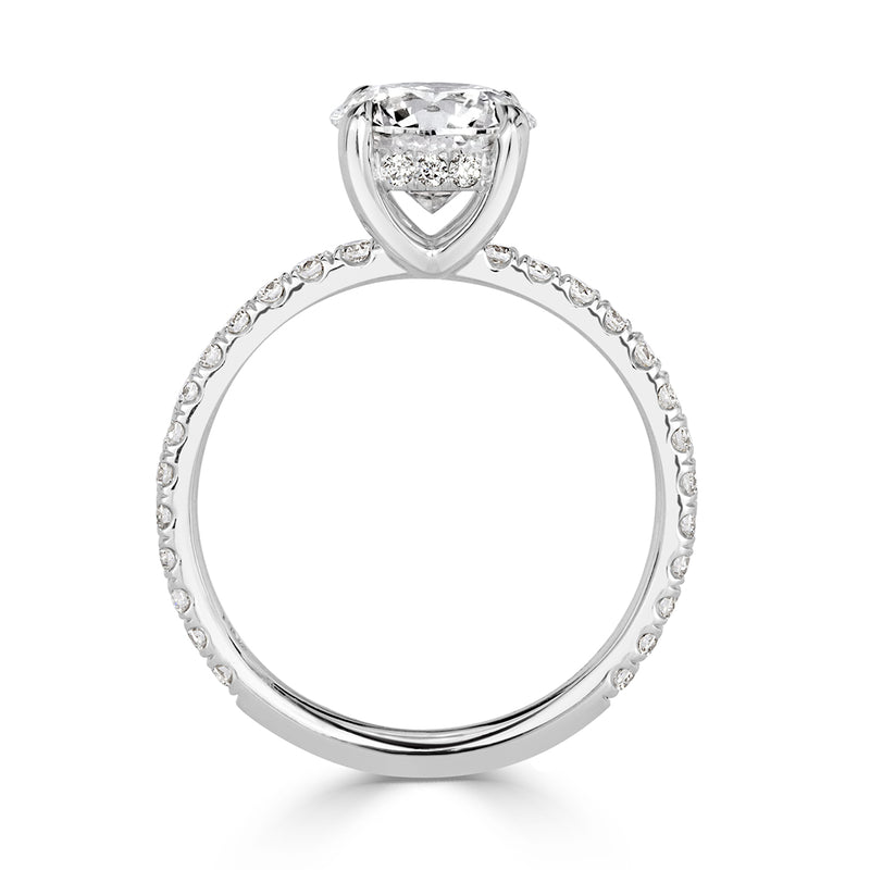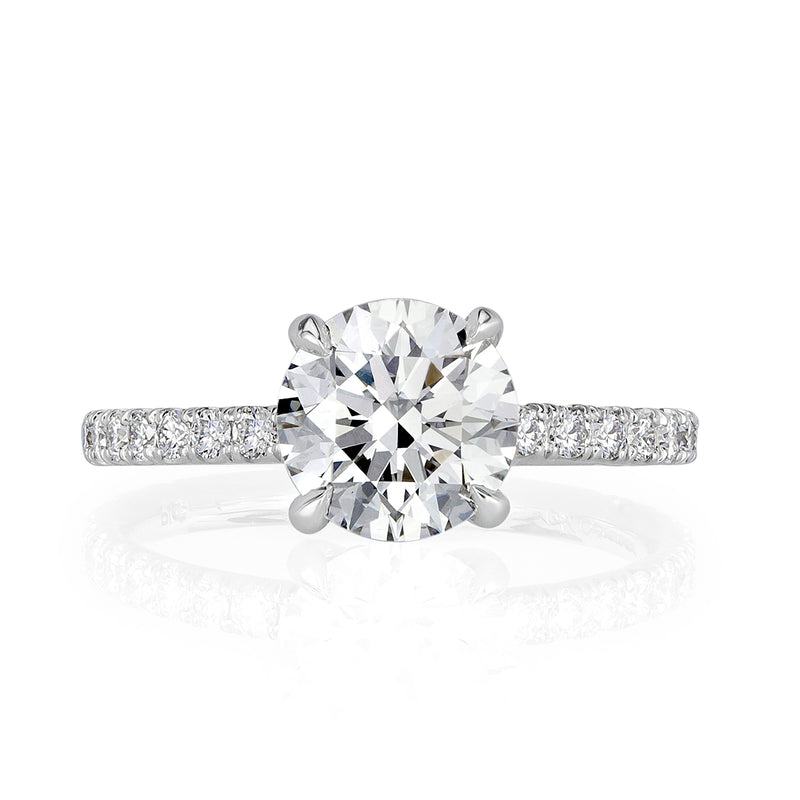 The beautiful round brilliant cut diamond set in this elegant engagement ring is captivating to say the least. The stunning 1.70ct round brilliant cut center diamond is GIA certified at F-VS2, a spectacular combination! The diamond is absolutely colorless and displays immense brilliance due to it's top grading of a 3X Excellent cut grade. The one and three-quarter carat center diamond is handset in a dainty platinum setting with a subtle hidden halo basket of additional diamonds. The side diamonds are all certified at premium E-F colors, VS1-VS2 clarities. Viewed from any angle, this round brilliant cut diamond engagement ring will attract the eyes of any!