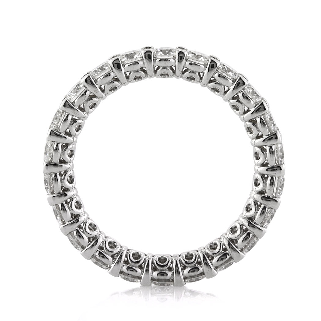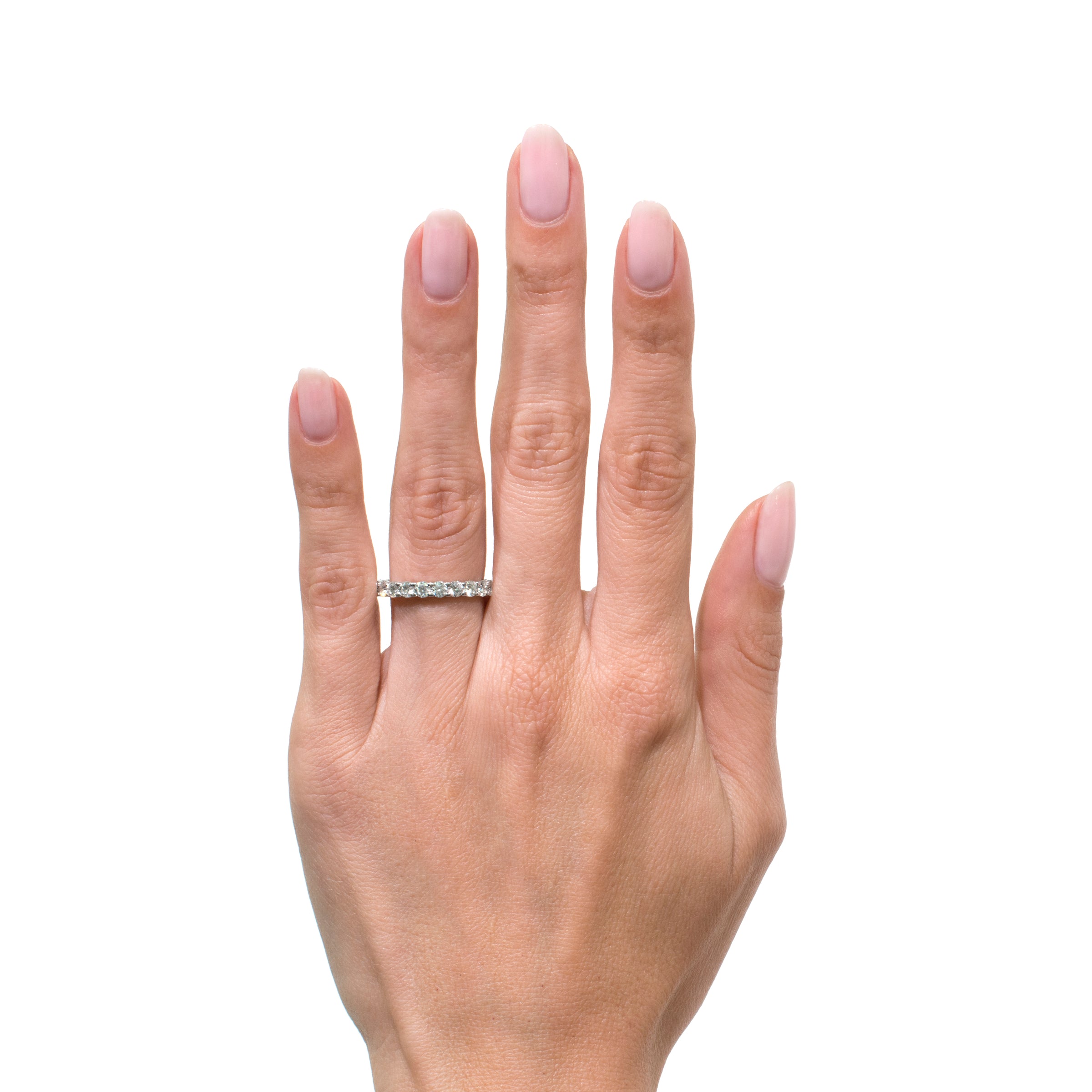 It's the little details that sets this round brilliant cut eternity band apart from the rest. The gorgeous gallery work inside the diamond band is very fine and intricate. Each brilliant diamond is perfectly hand set next to one another in the shared-prong, 18k white gold setting. It is an amazing band that looks perfect on its own or stacked with another piece.