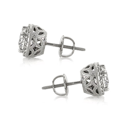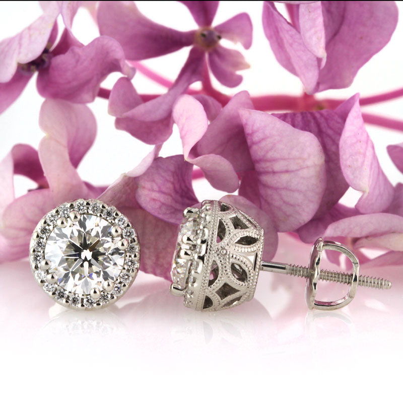This pair of round brilliant cut diamond earrings are simply spectacular. Two GIA certified round brilliant cut diamonds totaling 2.00ct are featured at the center of this elegant halo setting. The two carat total weight center diamonds are incredibly white with a phenomenal cut. The ornate basket is embellished with fine filigree, and there is also milgrain detail throughout for a very classy, vintage look. The backs are screw backs for added security. These beautiful round brilliant cut earrings will draw compliments for a lifetime!
