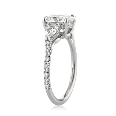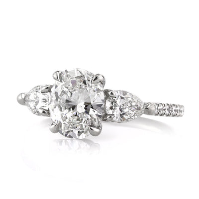 Fall head over heels in love like never before with this three-stone oval cut diamond engagement ring. The expertly crafted three-stone designer setting features a unbelievably gorgeous 1.46ct oval cut diamond GIA graded at G-VVS1, very white and nearly flawless! The oval's shape is quite pleasing and full and cut is plainly brilliant. The almost one and half carat center stone is flanked by two lovely pear shaped diamonds and further accentuated by a row of micro pavé round brilliant cut diamonds going down the shank. The little details not to be overlooked are the diamond on the basket of the three stones that can be seen from the side view. It's a touch of detail that adds a ton of beauty. From every angle, this spectacular oval cut diamond ring displays exquisite craftsmanship and unparalleled artistry.