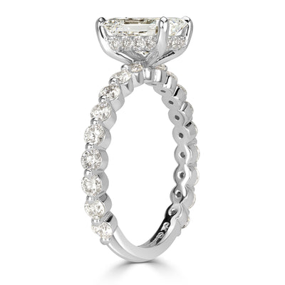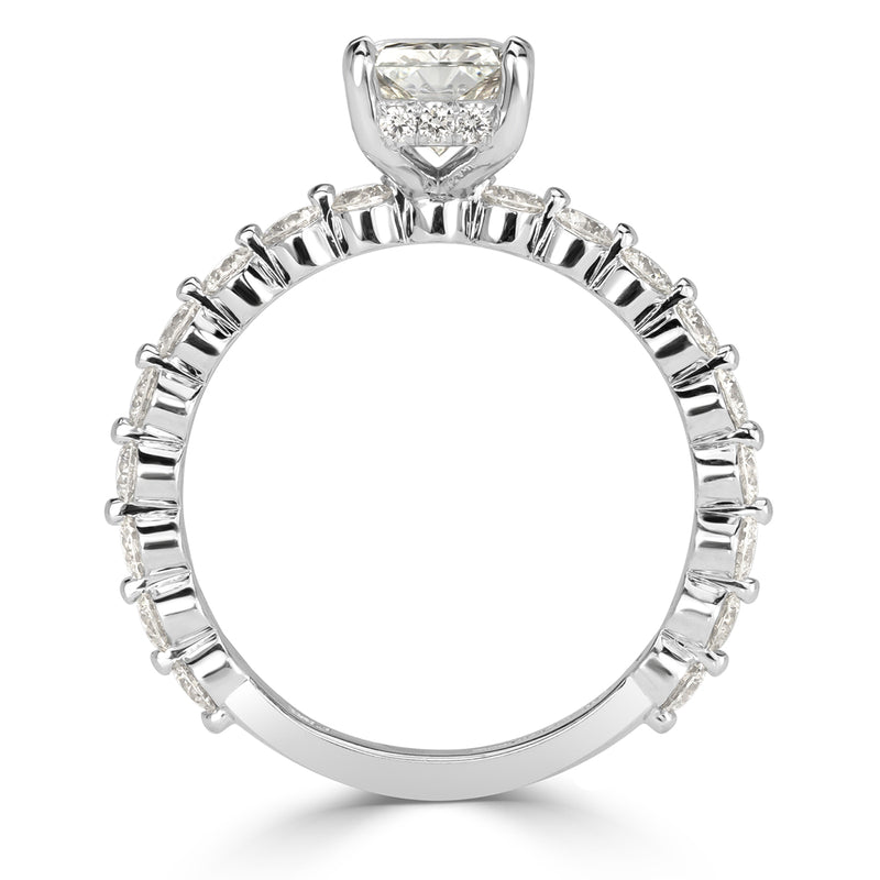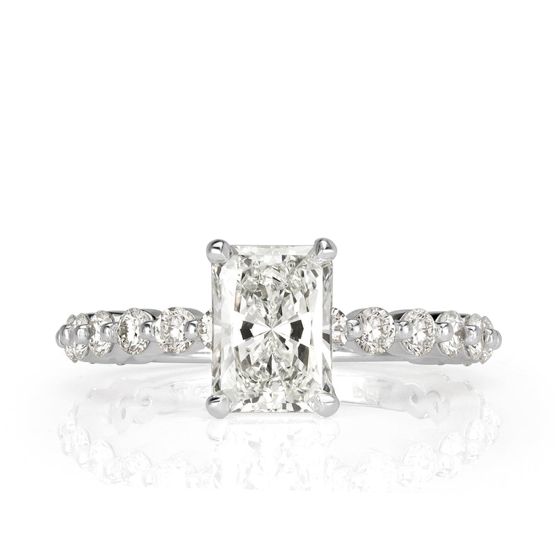 Breathtaking and unique, this radiant cut diamond engagement ring is a true stunner. The gorgeous 1.40ct radiant cut center diamond is GIA certified at H-VS1, with incredible proportions of 7.89 x 5.71 mm. Excellent in symmetry and polish, this beauty is tremendously brilliant. The lovely center stone is set in a delicate hidden halo, surrounded by single-prong set round brilliant cut diamonds, adding a feminine touch. This ring is sure to bring a smile to your loved ones face for years to come!