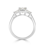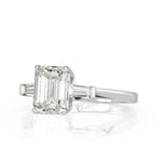 This three-stone emerald cut diamond engagement ring is such an outstanding value! The gorgeous 2.01ct emerald cut center diamond is GIA certified at I-VVS2. It is exceptionally white, has a mesmerizing cut and is nearly flawless in clarity. This beauty measures at an amazing proportion of 8.25 x 6.13 mm. It is accented by a tapered baguette cut diamond on either side. The diamonds sparkle tremendously. Handcrafted in a high polish platinum setting, this emerald cut diamond engagement ring is stunning from every angle!