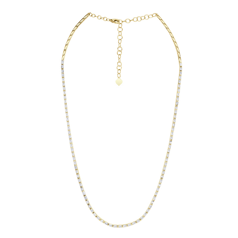 This one-of-a-kind necklace features 2.34ct of baguette cut diamonds. They are certified at G-H, VS1-VS2 qualities and face up super white. The clasp is created for adjustable lengths and  allows for versatility. The gorgeous 14k yellow gold setting allows the sparkling white of the diamonds to truly pop on the neckline!