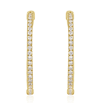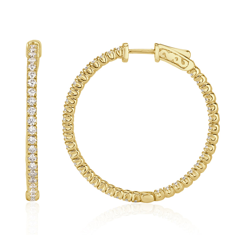 This beautiful pair of diamond hoop earrings is great for daily wear or dressing up a night out! They are set with 2.35ct of round brilliant cut diamonds in a warm 14k yellow gold. These earrings are set with bright, white and brilliant diamonds on the front and back sides of the design, giving you sparkle from every angle! They measure 1.25 inches from top to bottom.