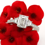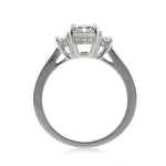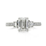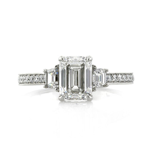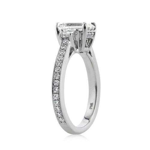 Pair this exquisite emerald cut diamond engagement ring with your elegant lady. The three-stone setup is very well designed with pleasing proportions. The 1.60ct emerald cut center diamond is GIA certified at F-VVS, a superior color and clarity combination. The well cut diamond is colorless and nearly flawless. The faceting is beautiful and creates a lovely, slow elegant sparkle. Two trapezoid cut diamonds frame the center diamond giving the ring the traditional three-stone appeal. Round brilliant cut diamonds are set down the shank and on the side of the basket for extra sparkle. Put perfection on her finger with this emerald cut work of art.