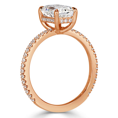 Handcrafted in 18k rose gold, this exquisite emerald cut diamond engagement ring showcases a mesmerizing 2.02 emerald cut center diamond GIA certified at J-VVS1. It faces up white, has exceptional clarity, and measures at a beautiful 8.46x5.75mm! It is accented by a hidden halo of round brilliant cut diamonds as well as one row of micro pavé set diamonds going down the dainty shank. Timeless design and outstanding quality, this superb diamond engagement ring has it all!
