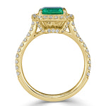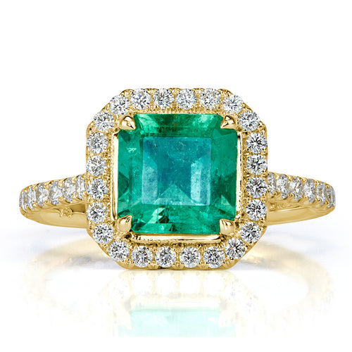 Glamourously vibrant rich in color, this 1.73ct emerald engagement ring is a positively bold look. The emerald cut gemstone sits beautifully against the warm hues of the 18k yellow gold setting. Accented by glimmering white round brilliant cut diamonds on the halo and shank, this piece is a definite stand out amongst the rest! With additional diamonds adorning the connectors and subtle art deco filigree details embedded into the basket, this fine jewelry piece is truly a work of art. This beauty is sure to make her jaw drop as soon as she opens up the Mark Broumand box!