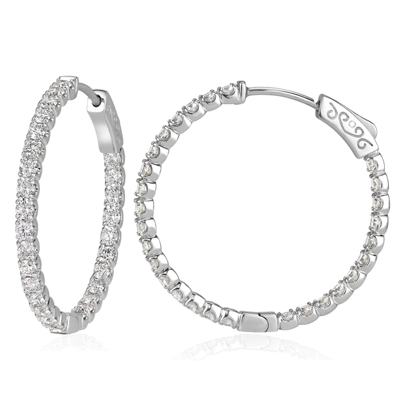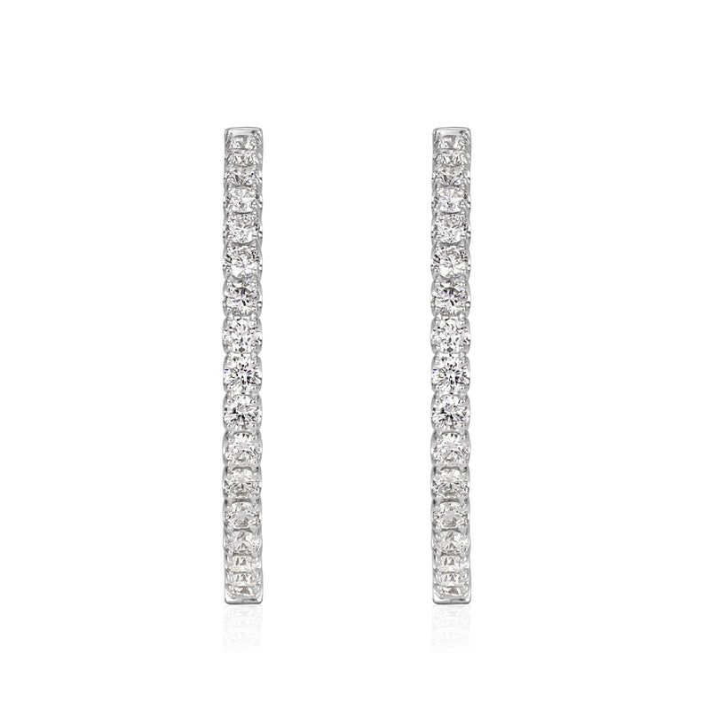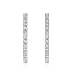 This beautiful pair of diamond hoop earrings is perfect for daily wear or a dressy night out! They are set with 2.37ct of round brilliant cut diamonds on a high polish 14k white gold. These stunners are set with exceptionally white and brilliant diamonds on the front and back sides of the earring for extra sparkle. Measures 1 inch from top to bottom.