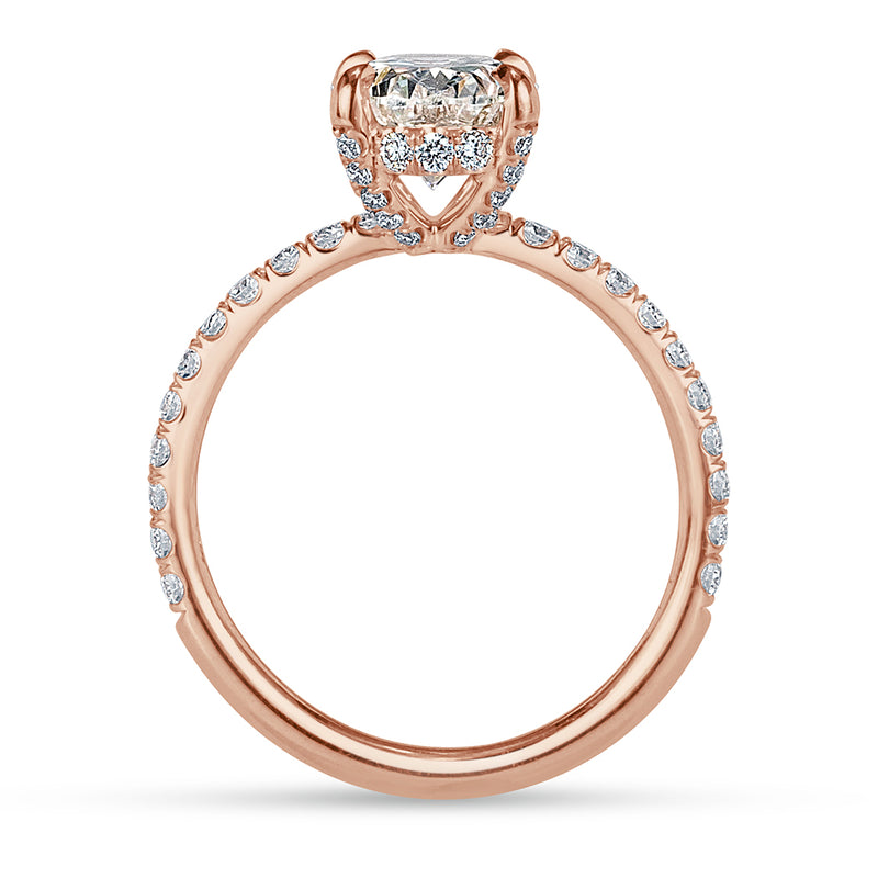 She'll be instantly obsessed with her ”precious” as soon as you place it on her finger. The mesmerizing center diamond is a 1.83ct oval cut diamond GIA certified J-VVS2, near colorless and completely eye clean. It is set on an 18k rose gold setting that is dainty and very finely crafted. The stunning basket has diamonds set up the prongs and on the connector for a sparkle that can be seen for a mile away. There are also round diamonds set down the shank just past halfway. You won't be able to pry her ”precious” off her finger