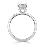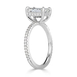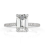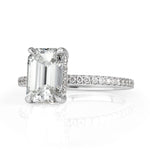This elegant and beautiful emerald cut diamond engagement ring features a 2.01ct center diamond. It is GIA certified at H-VS2. The diamond is white, very clear and the cut is spectacular. It has an incredibly elongated cut, measuring an outstanding 9.05 x 6.34mm and sits beautifully on the finger. The ring is made in platinum and features a row of round diamonds in a micro pavé setting down the sides of the shank and in between the center prongs, under the halo.