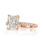 This radiant cut diamond engagement ring is exactly what she has been looking for! This design features a beautiful 2.01ct radiant cut center diamond that is GIA certified at J-VS1. The centerstone faces up a bright white and is super clear. This stunner also faces up at an amazing 1.40 ratio, measuring at 8.75 x 6.24mm. It is graded excellence in polish and symmetry, the cut is phenomenal and it sparkles with intense fire. Perched on our signature hidden halo detail, the whiteness of the center diamond truly pops against our warm 18k rose gold metal setting. Shimmering round brilliant cut diamonds are individually handset going down the shank 3/4 of the way. This radiant cut diamond engagement ring is elegance at it's finest and will sparkle from miles away!