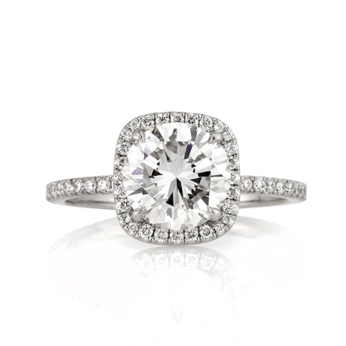 This mesmerizing piece is astonishing in so many ways. The remarkable 1.88ct round brilliant cut center diamond is EGL certified, one of the leaders in diamond grading, at H-SI1. It is white and perfectly eye clean. The cut is gorgeous and it radiates with tremendous brilliance! It is accented by a halo of round diamonds and a row of round diamonds set down the shank in a micro pave setting. The connectors are also studded with round diamonds. The unique and beautiful round diamond with a cushion halo combination is so incredibly stunning! You will love how it looks on. An outstanding piece at a great value. A perfect symbol of your love and devotion now and forever!