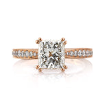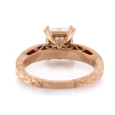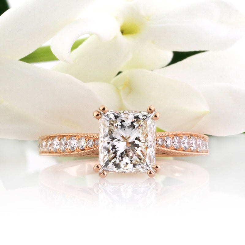 Vintage style details like milgrain and filigree gives this princess cut diamond engagement ring a lovely vintage flair. The 2.04ct princess cut center diamond is GIA certified at K-VS1. It has a warmer glow and is crystal clear even under 10X magnification. It is accented by round diamonds in a pavé setting, graduating from smaller to larger diamonds and then smaller again as it goes down the sides. This 18k rose gold masterpiece is hand engraved on all three sides with gorgeous intricate detail. This princess cut diamond engagement ring is truly fit for a princess.