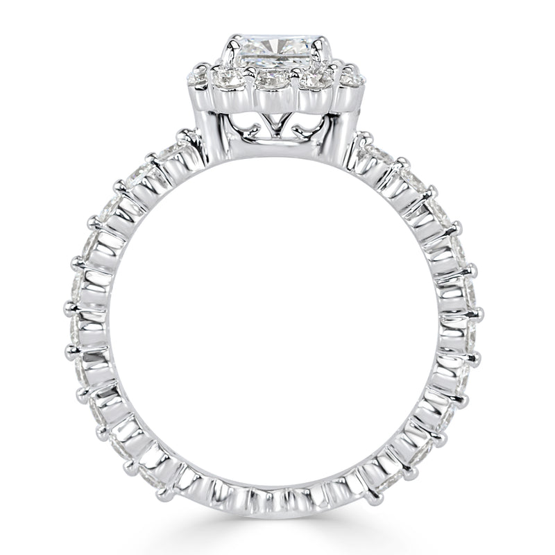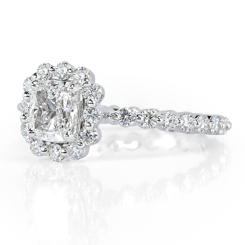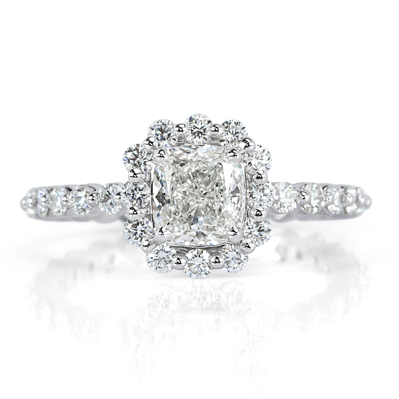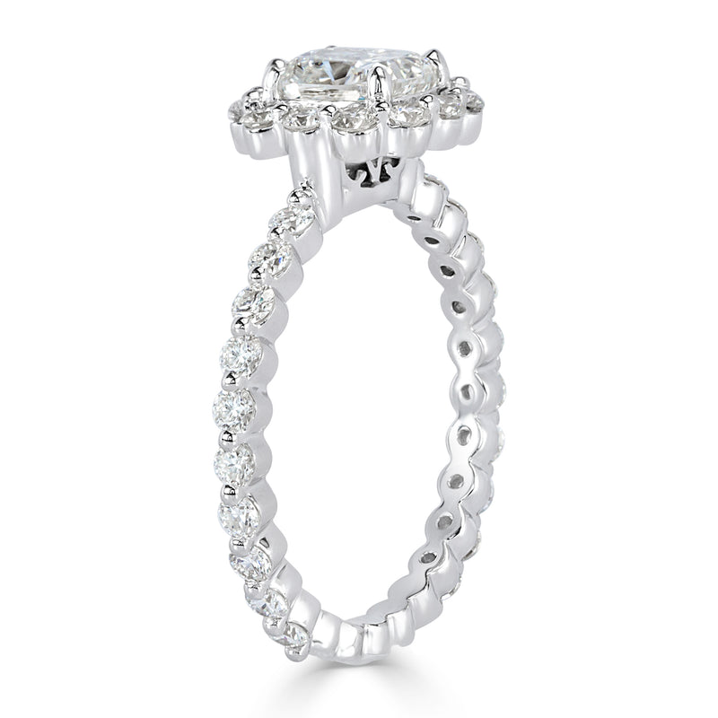 This cushion cut diamond engagement ring is mesmerizing! A beautiful GIA certified H-VS2 cushion cut diamond sits perfectly in a shared prong 18K white gold setting. This exceptionally white and brilliant diamond is accented by sparkling round brilliant cut diamonds set in the halo and shank. The delicate design allows for these gorgeous diamonds to really pop. It is absolutely stunning from every angle!