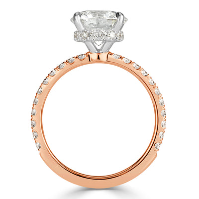 This two-tone diamond engagement ring is everything that she has been looking for! The centerpiece showcases a gorgeous 2.01ct round brilliant cut diamond that is GIA certified at J-VS1. The tiny feather on the side of the diamond allows it to look more like a VVS1 under 10x magnification and by the naked-eye it is absolutely spotless! This beauty faces up a bright white, is super sparkly and is graded at excellence in cut, polish and symmetry. Set on a luxurious 18k white gold wrap diamond basket, this diamond is perched on top a diamond encrusted 18k rose gold shank. The rose gold allows the crisp whiteness of the diamonds to truly pop! Capture her heart for forever with this incredible round brilliant cut diamond engagement ring!