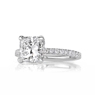 This incredible cushion cut diamond engagement ring is nothing if not dazzling and gorgeous. Featuring a stunning 2.03ct center cushion cut diamond GIA certified at D-SI2, this ring is sure to impress. The diamond sparkles beautifully with it's crisp, brilliant cut facet patterning. It faces up completely colorless and eye-clean, displaying more like a VS+ diamond even under 10x magnification! This beauty measures at an amazing proportion of 7.62 x 7.07mm. The shimmering platinum setting allows the centerpiece to shine and the dainty band of round brilliant diamonds add just the right amount of additional sparkle. Diamonds are also set on our signature hidden halo and up the prongs as well. Give her everything she has been dreaming about with this one of a kind cushion cut diamond ring.